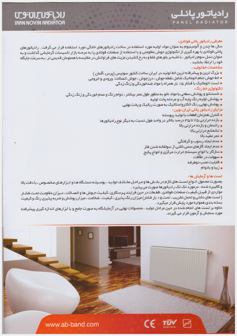 رادیاتور پنلی ایران نوین محصول جدید شرکت آب بند است که با دستگاه های تمام اتوماتیک اروپایی و تحت استاندارد ایران و CE اروپا تولید می شود .
